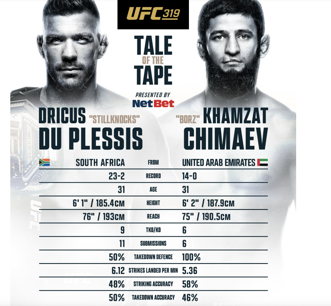 Sul lato opposto, l’ormai noto stile di combattimento di Du Plessis conosciuto con lo slogan “awkward on purpose” questa volta non ha avuto alcun effetto positivo sull’avversario diretto. Quei pochissimi minuti di striking in piedi hanno mostrato una leggera predominanza del sudafricano, ma è chiaro che con Chimaev, anche in un ipotetico rematch, il rischio reale è quello di restare, per la quasi totalità della sfida, sotto pressione (costretto a confrontarsi sul terreno del wrestling, dove “Borz” è nettamente e fisicamente più forte).