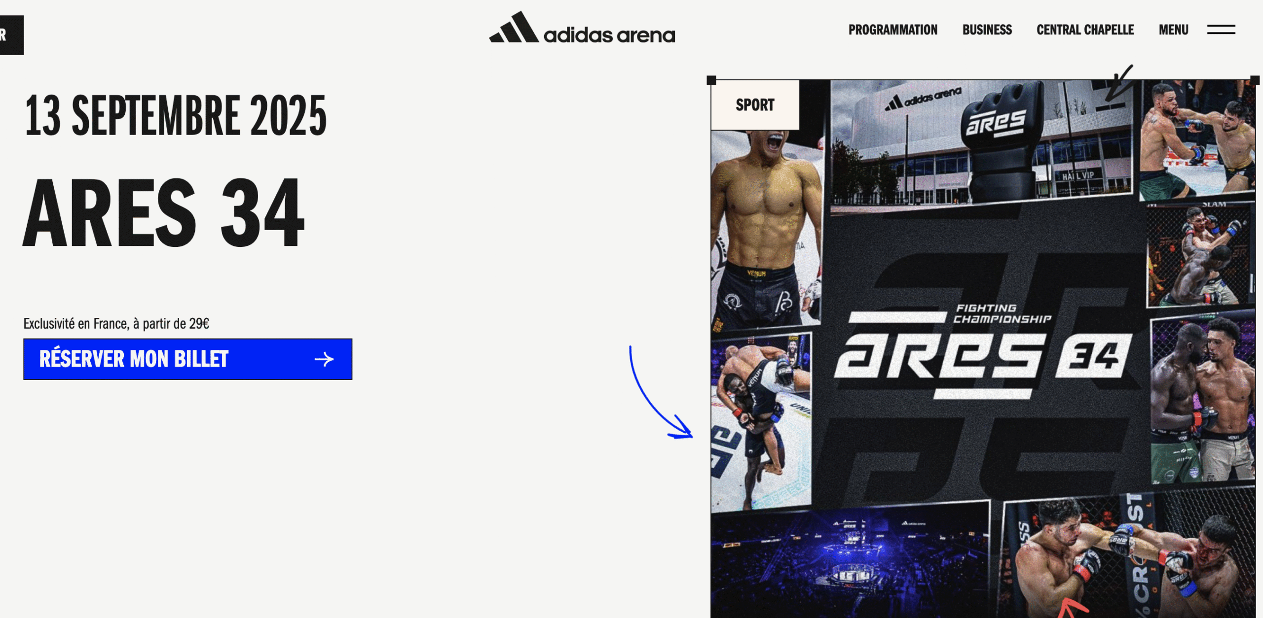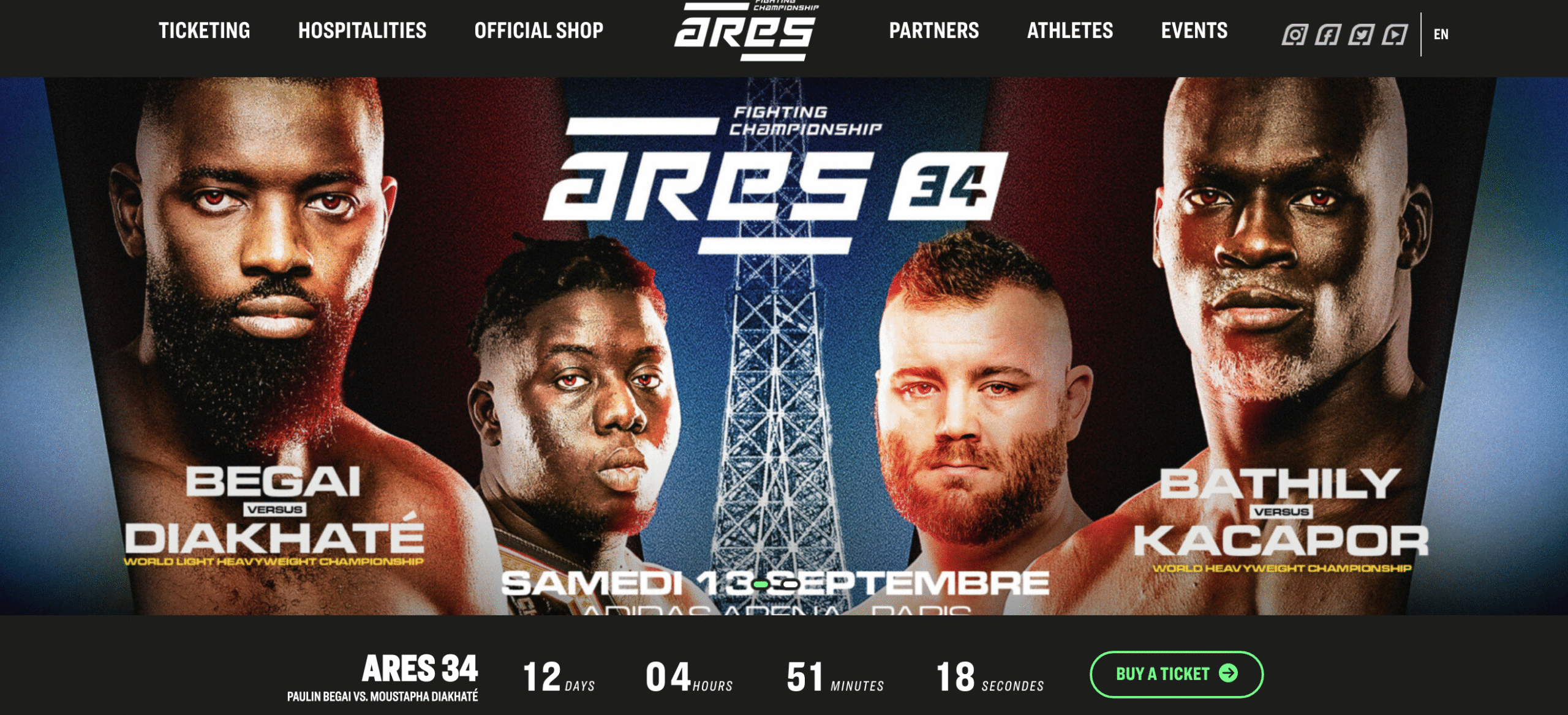 Ares #34 si svolgerà il 13 settembre 2025 (ore 19:30) presso l’adidas Arena, nota anche come Porte de la Chapelle Arena, situata nella zona nord di Parigi. Si tratta di una tappa prestigiosa del circuito Ares Fighting Championship, la principale organizzazione francese di MMA, attiva dal 2019. L’evento porterà sul ring il meglio della scena francese e internazionale, con combattimenti ad alta tensione e un’atmosfera elettrizzante.