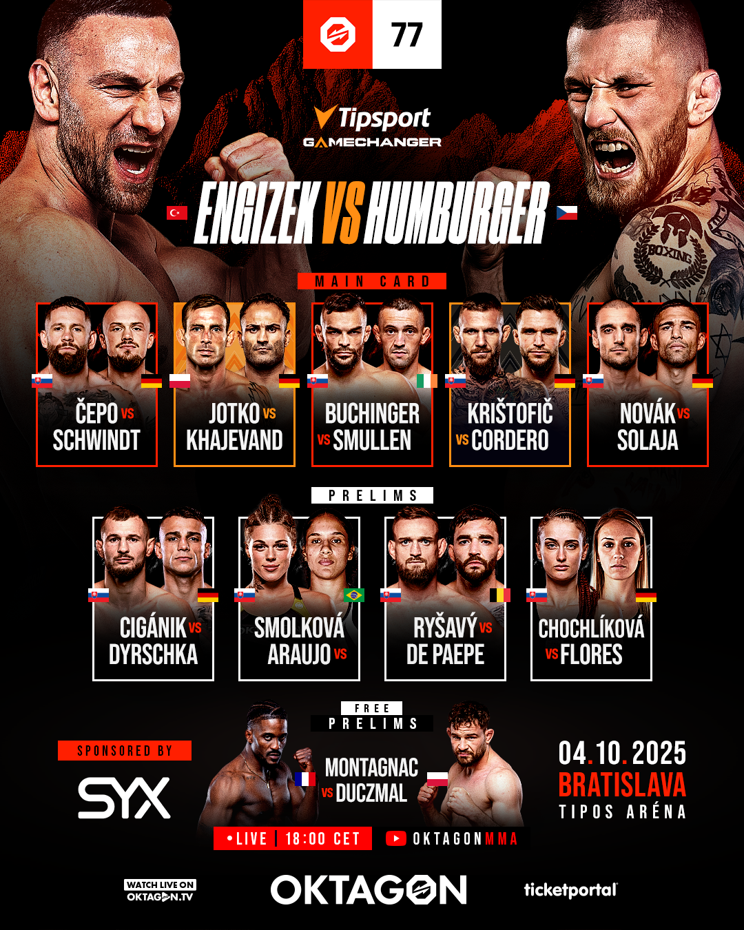 Vlasto Čepo (destra) sarà opposto Daniel Schwindt (sinistra) in un match ad alto tasso di spettacolo. Oktagon 77 sarà trasmesso in diretta su OKTAGON.TV a livello internazionale e i fan in Germania potranno guardarlo su RTL+. Gli spettatori in Francia potranno seguirlo su RMC Sport e in Grecia su Cosmote.tv. In Turchia sarà trasmesso da S Sport Plus. Lo show comincia alle 17:00 BST / 18:00 CEST / 12:00 ET / 9:00 PT.