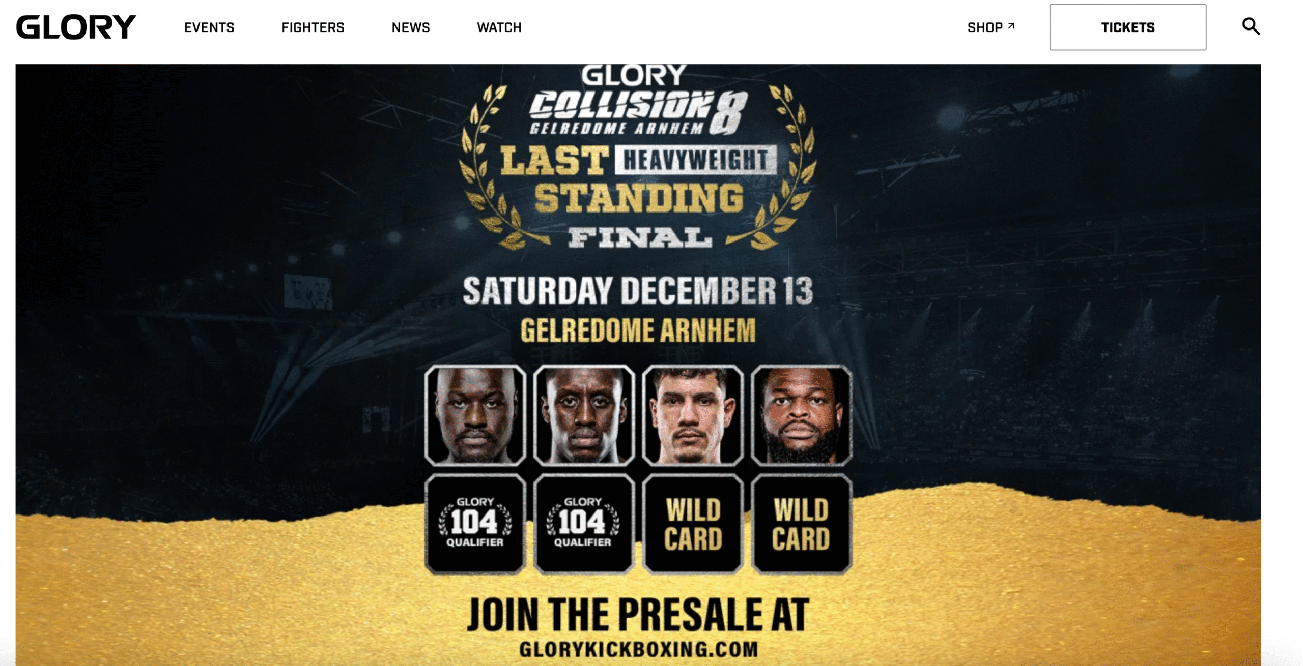 L’evento di kickboxing più atteso dell’anno è ufficiale. Il torneo GLORY Last Heavyweight Standing si concluderà con “COLLISION 8″, in programma il 13 dicembre al GelreDome, stadio di calcio (vi gioca il Vitesse) situato ad Arnhem (un impianto anche per eventi indoor con una capienza massina di 21mila posti a sedere), nei Paesi Bassi.