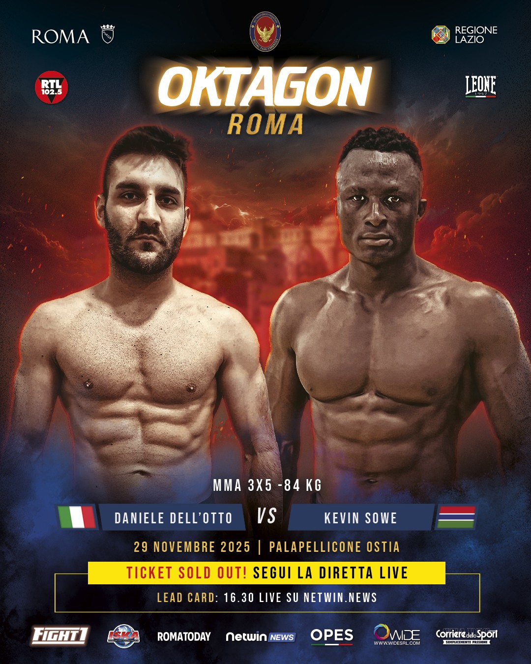 Nelle MMA (mixed martial arts), al limite degli 84kg, Oktagon Roma (in programma il prossimo sabato 29 novembre 2025 al Pala Pellicone di Ostia) offrirà un match che si preannuncia senza esclusione di colpi. Per il “Gloria Fight Center” di Roma ci sarà Daniele Dell’Otto diretto all’angolo dall’ex fighter UFC, il romano Alessio Di Chirico. Trenta anni con un record “pro” di 2-1-0, già membro della nazionale IMMAF, che si confronterà con Abdoul Sowe, detto “Kevin Kunta”, solido gambiano in forza al Fight Club di Firenze (diretto all’angolo dal maestro Luca Della Rosa e Kleber Araujio).
