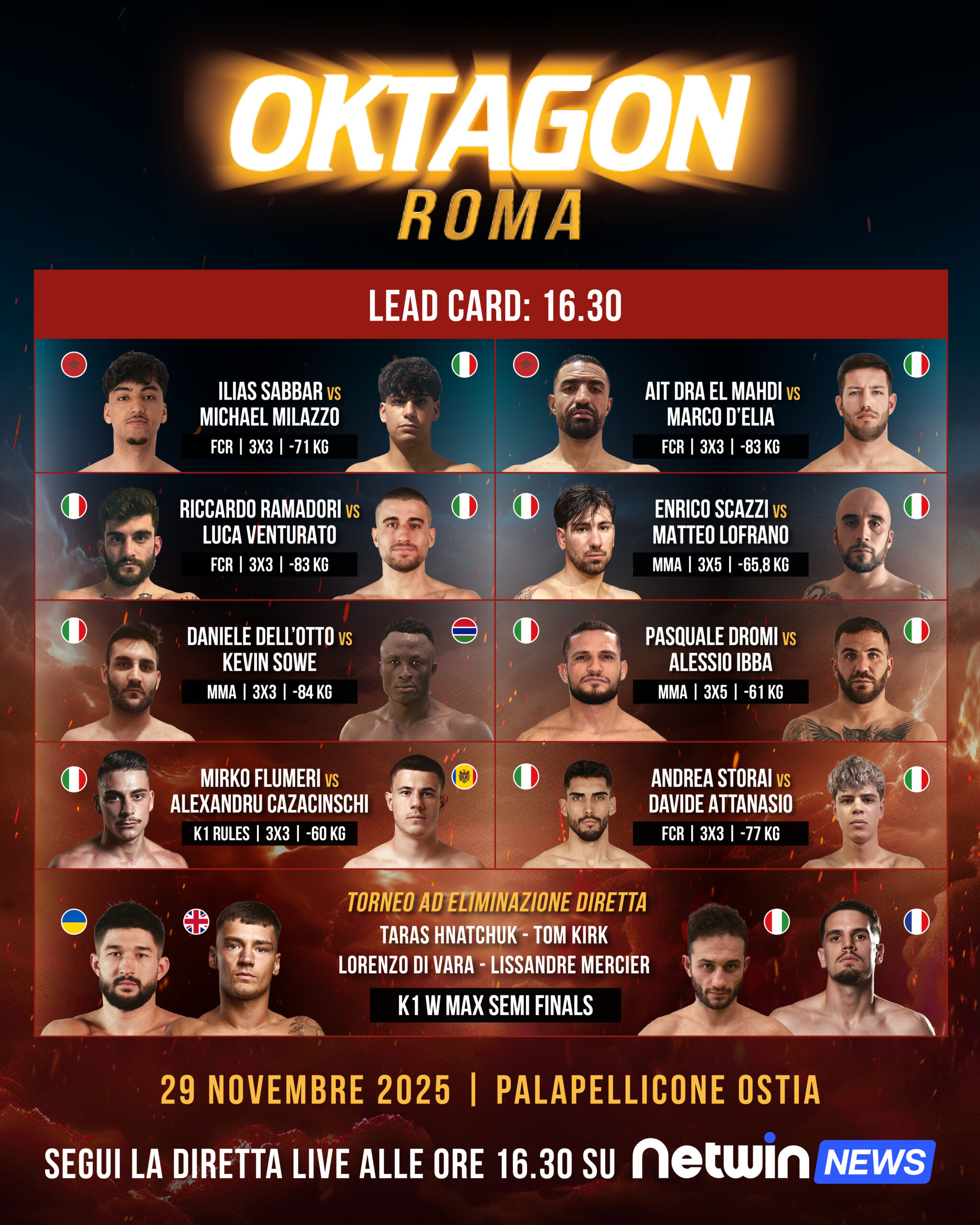 Netwin.news segna il proprio debutto negli sport da combattimento offrendo gratuitamente tutta la Lead Card di Oktagon Roma: un’innovazione che amplia l’accessibilità dell’evento e coinvolge direttamente la community dei fan, compensando il sold out anticipato del galà.