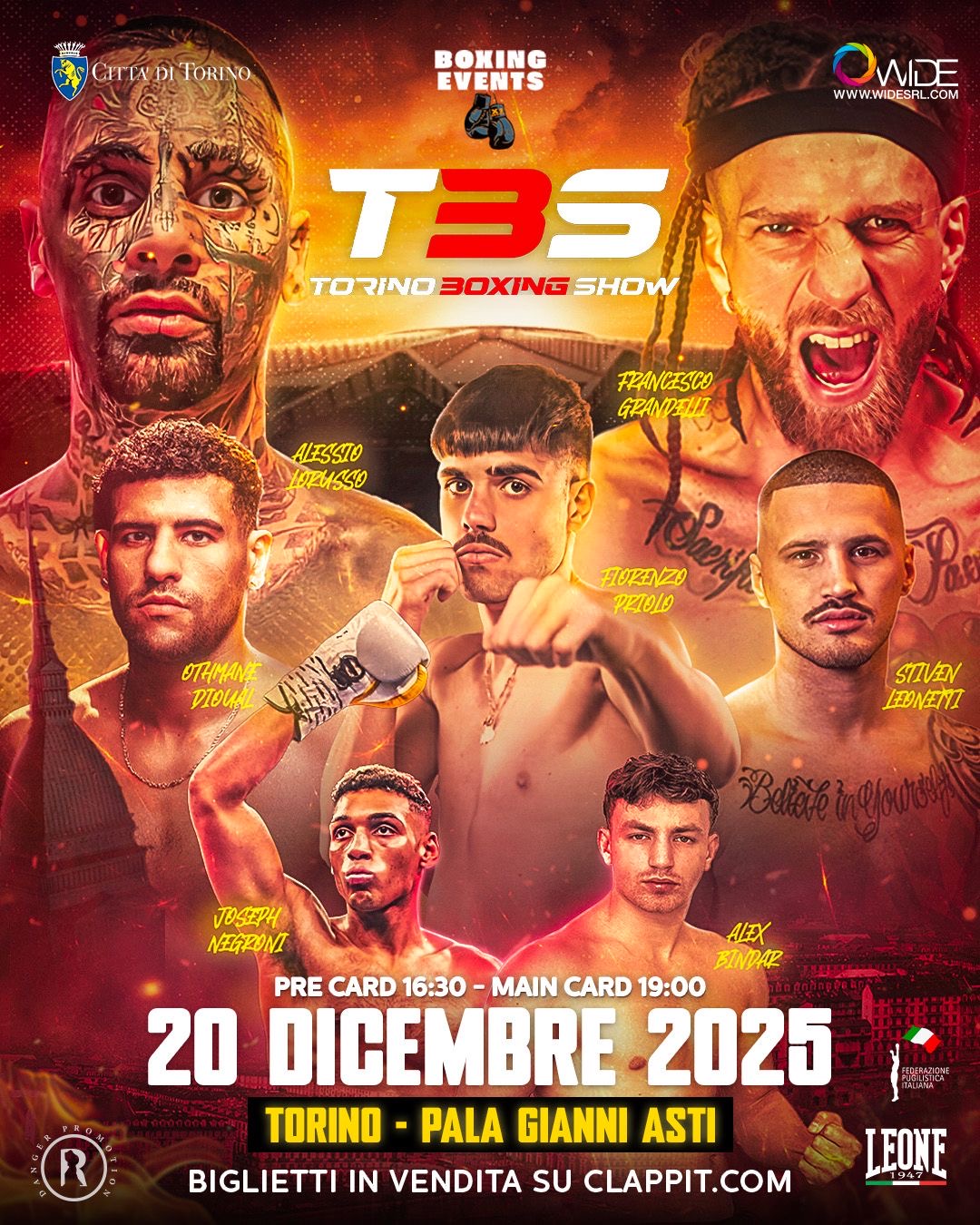 Sabato 20 dicembre è in programma, al Pala “Gianni Asti” di Torino (ex Pala Ruffini), la prima edizione di Torino Boxing Show (TBS), gran galà dedicato al pugilato professionistico. Organizzato dalla Boxing Events ASD, e sotto la guida del promoter piemontese Filippo Violante, ha in programma 11 incontri, per un totale di 22 atleti.