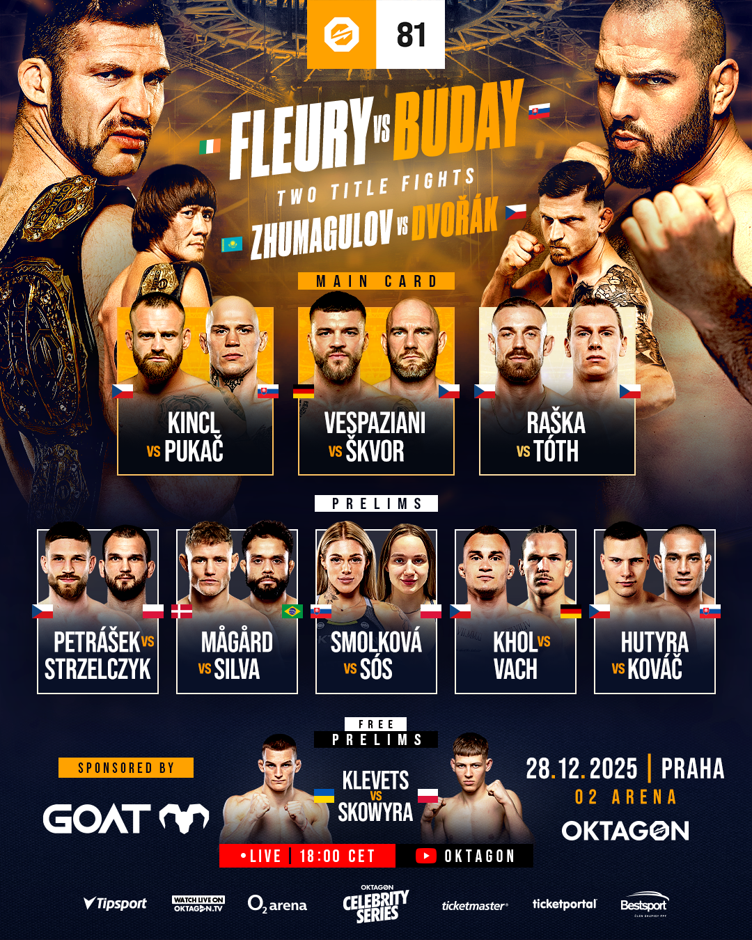La O2 Arena di Praga ha fatto da cornice a una notte di grande MMA con Oktagon #81, evento che ha confermato lo status della promotion ceca come una delle realtà più solide del panorama europeo. Davanti a migliaia di spettatori, il main event non ha tradito le attese: l’irlandese Will Fleury ha difeso il titolo dei pesi massimi con una prestazione autoritaria, chiudendo i conti contro l’ex UFC fighter Martin Buday con un TKO fulmineo nel primo round (in appena un minuto e 40 secondi).