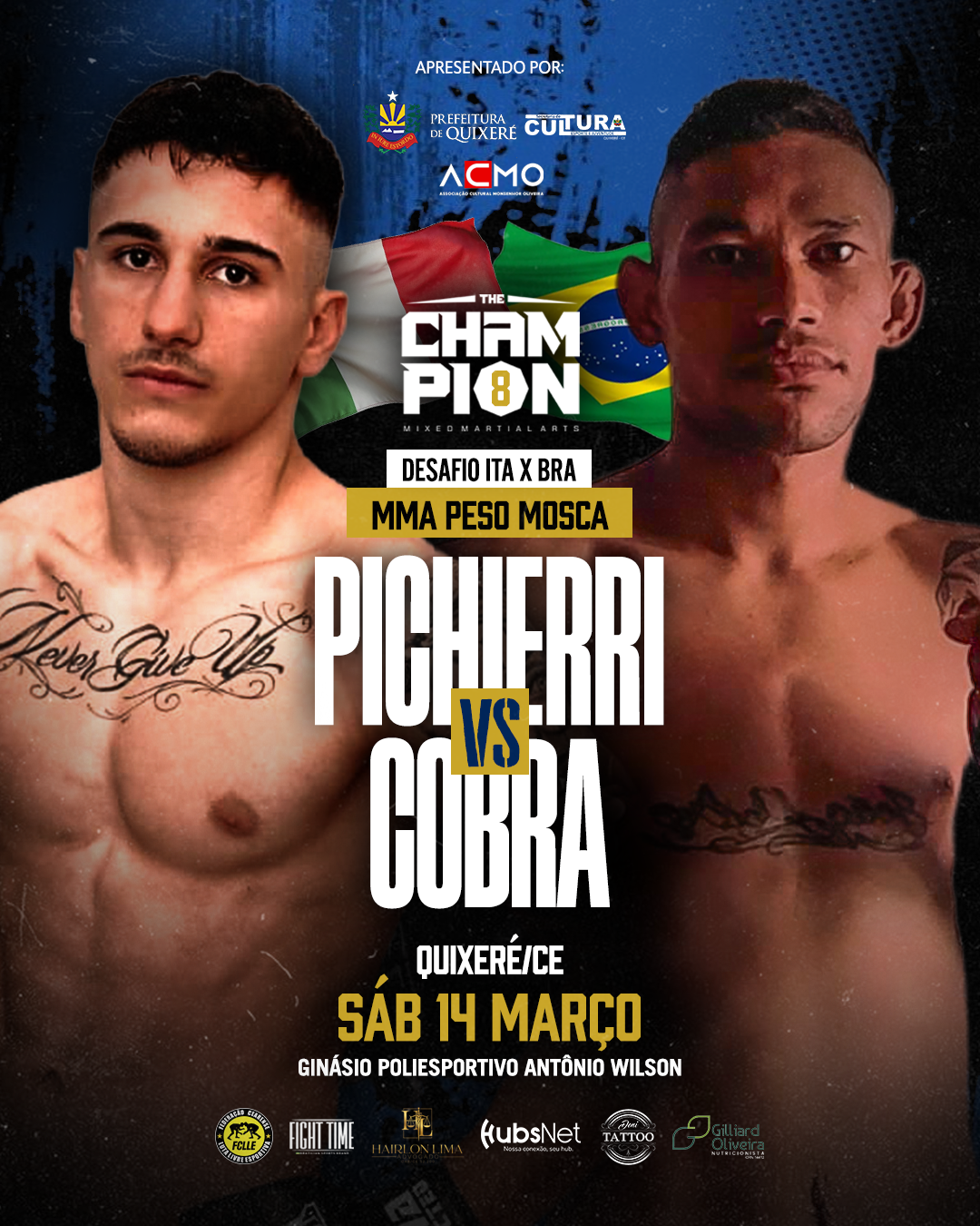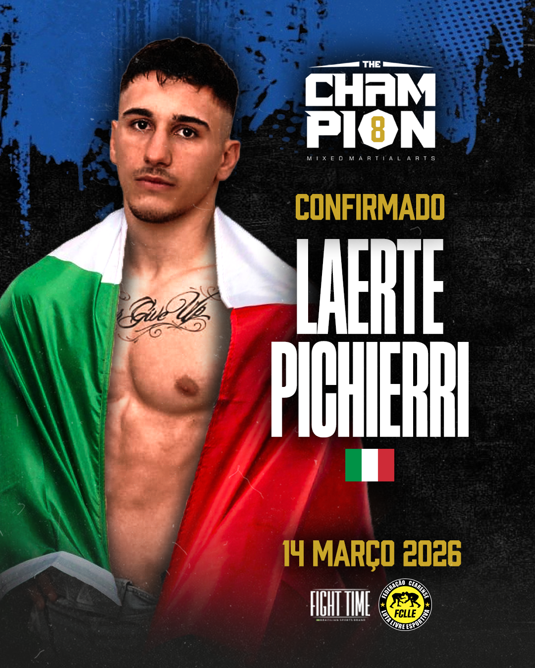 Il 25enne Laerte Pichierri (nella foto in primo piano a sinistra), atleta di punta della nazionale Fight1 di mixed martial arts (si allena al “Centurion Club” di Manduria, in provicina di Taranto), è tra i fighter più attesi della promotion brasiliana “The Champion MMA” (TCMMA), che, il prossimo sabato 14 marzo 2026, combatterà all’evento numerato “8” (a Quixerè/CE -Bra) contro l’esperto verdeoro Cobra nella categoria “flyweight” (fino a 57 kg, anche se Pichierri ha combattuto anche nei 61 kg). Il campione pugliese, allenato da Giulio Morgante (DT della nazionale FIGHT1 di mma), è un “pro” con uno score record di 5 vittorie e 4 sconfitte.