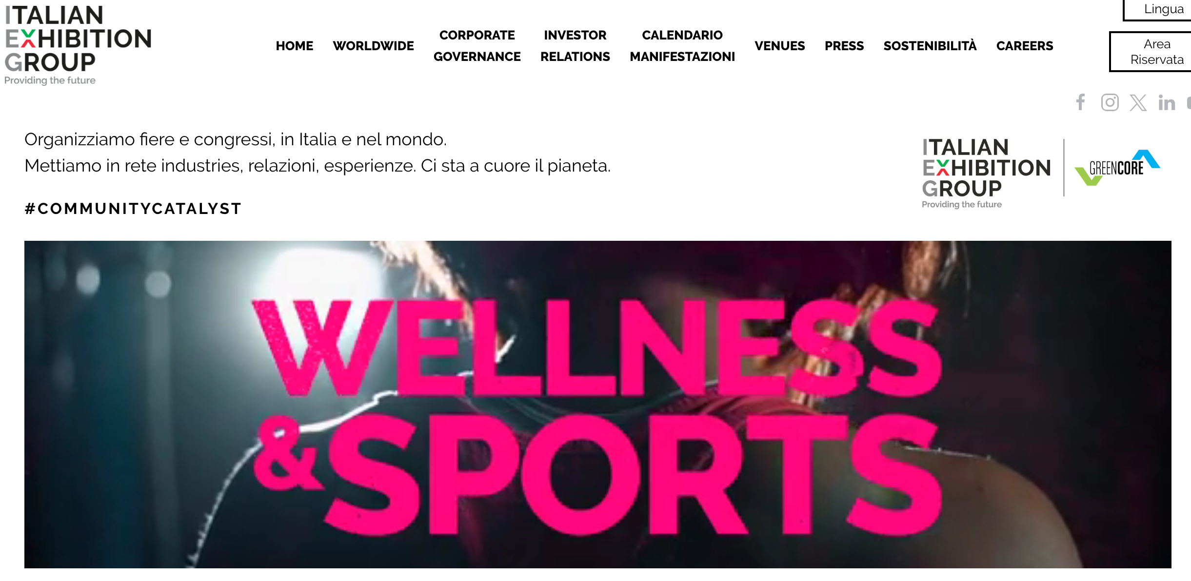 - Da oltre 70 anni Italian Exhibition Group organizza fiere (tra queste una delle più importanti è Rimini Wellness), eventi e congressi in Italia e nel mondo. La sua mission è quella di offrire ai partners nazionali e internazionali opportunità di affari concrete, contenuti e servizi ad alto valore aggiunto, occasioni d’incontro. Strutture moderne, elevata qualità del lavoro, innovazione, capacità di networking, connessione territoriale sono gli asset che guidano l’attività di IEG, player di profilo europeo.
