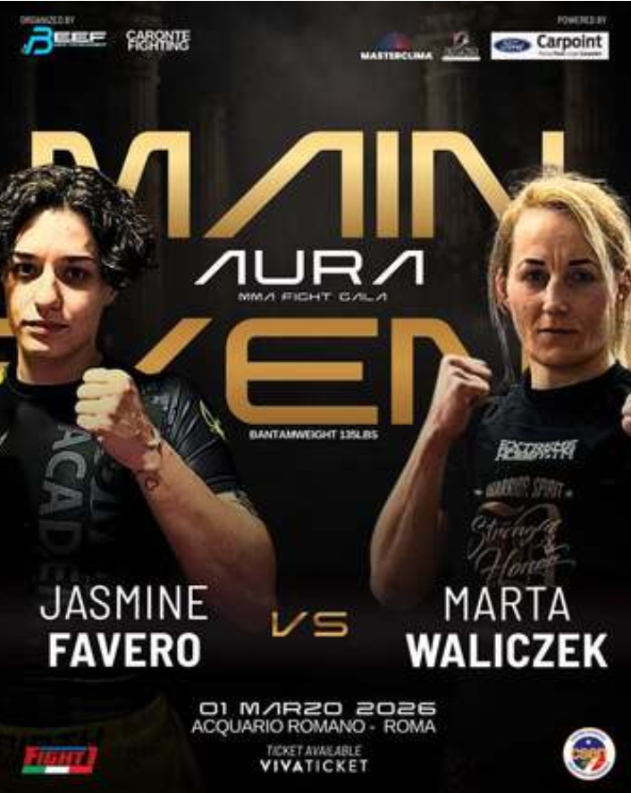 Il main event vede la 38enne polacca Marta Waliczek una “veterana” delle MMA affrontare l’italiana Jasmine Favero. “Wadera” ha combattuto in diversi Paesi (incluso l’Egitto) per importanti promotion del calibro di Oktagon MMA, Ares Fighting e PFL. Ha un background da karateka e si presenta con uno score record di 6-7-0. L’italiana (25 anni di erà) si presenta a Roma da imbattuta (6-0-0). Arriva da Vigonovo (comune della città metropolitana di Venezia) ed è la portabandiera della Combat Academy (Brugine/Veneto). “The Bull”, come ama farsi chiamare nella gabbia, ha combattuto in diverse promotion, con un netto 3-0-0 in Cage Warriors (popolare promotion di mma irlandese).