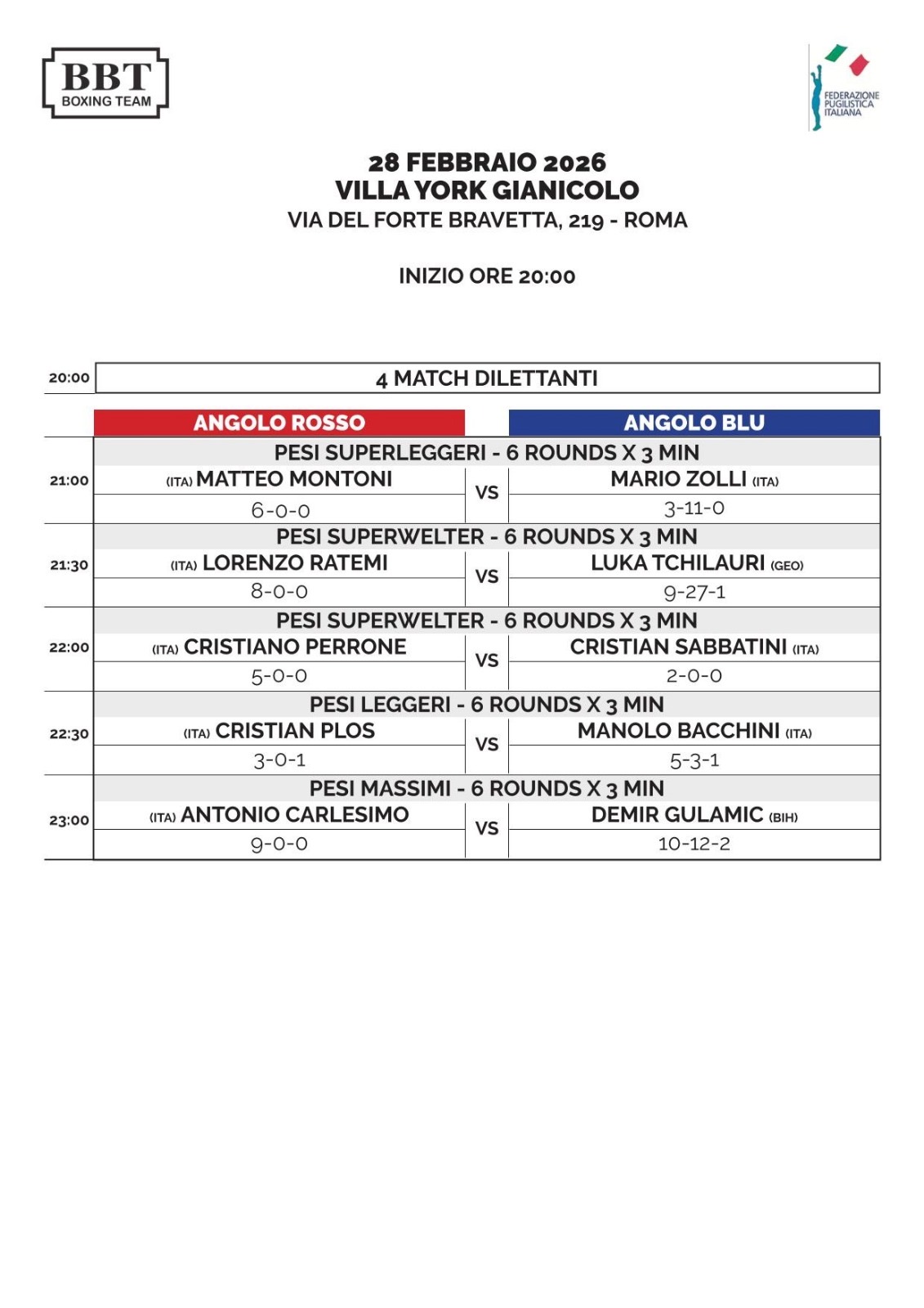 Torna la boxe (dilettantistica e “pro”) nel cuore di Roma. L’evento, denominato “I magnifici Sette”, è promosso dalla BBT (Buccioni Boxing Team)di Davide Buccioni (storico patron del pugilato tricolore) e si terrà domani sera (sabato 28 febbraio) a “Villa York” (via del Forte Bravetta, 219), con la main card (5 incontri professionistici) a partire dalle ore 21:00 (tutti da 6 round x3 minuti a testa). La parte “ama” prevede altre 4 sfide (a partire dalle 2o:00).