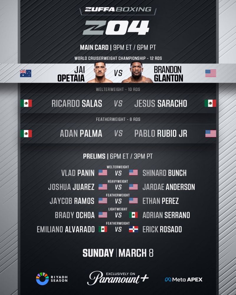 Intanto, nel principale sottoclou della serata (Zuffa Boxing #04) trasmessa, in esclusiva, da Paramount+, il welter messicano Ricardo “Magic Man” Salas (23-2-2, 17 K.O.) ha battuto per TKO il connazionale Jesus Saracho.
