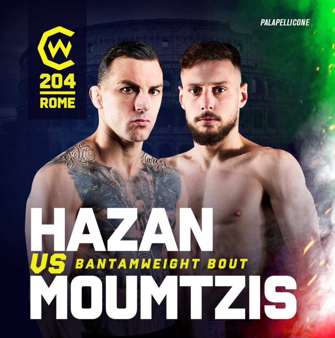 Dylan Hazan (nella foto in primo piano a sin.), 31enne fighter barese, forte di uno score record di 10-3-0, torna, dopo diversi mesi, a combattere a Roma, al Pala Pellicone di Ostia. L’occasione sarà l’evento Cage Warriors #204 il prossimo sabato 11 aprile 2026. Affronterà, nella divisione bantamweight ,il 26enne greco Alexandros Moumtzis, attualmente imbattuto (9-0-0). Quest’ultimo, dopo aver combattuto in diverse promotion elleniche (come le popolari QFL e AFC) ha debuttato a Cage Warriors #187 con una vittoria convincente contro lo scozzese Keir Harvie (8-5-2). Inoltre ha già combattuto, in Italia, in due edizioni di Messapicum (in Puglia).