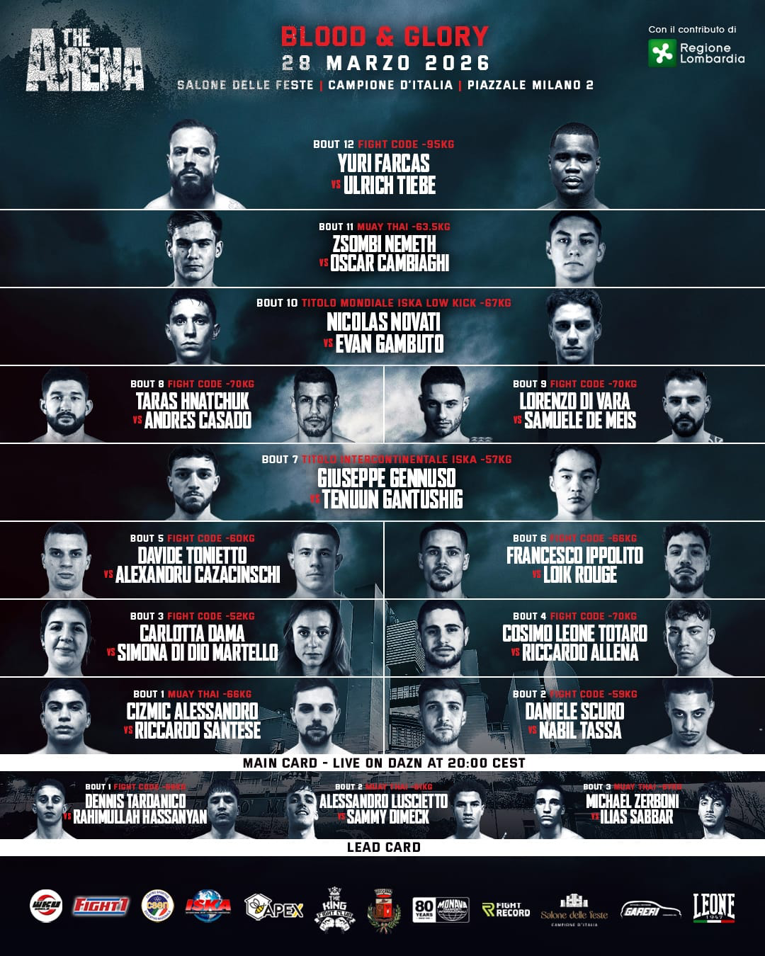 Dopo avere analizzato, ieri, la parte alta della fight card di The Arena UF – “Blood & Glory”, in programma sabato 28 marzo a Casinò di Campione d’Italia (un format ideato e gestito dalla coppia di promoter Scherini-Re) adesso entriamo nello specifico di tutti gli altri combattimenti previsti.