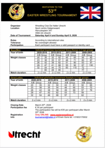 Si chiude con un bilancio decisamente positivo l’esperienza del CUS Bari all’“Easter Wrestling Tournament”, prestigioso appuntamento internazionale di lotta (organizzato ogni a Utrecht (l’organizzatore è UKV De Halter Utrecht) in Olanda e giunto alla sua 53ima edizione – nella foto in primo piano), che ha animato il weekend pasquale, tra il sabato santo e il giorno di Pasqua. Un evento di grande rilievo che ha visto la partecipazione di circa 800 atleti (600 solo dalla lotta greco-romana) in rappresentanza di 130 società provenienti da tutto il mondo (per un totale di 24 nazioni rappresentate), impegnati nelle specialità della greco-romana e della libera femminile.