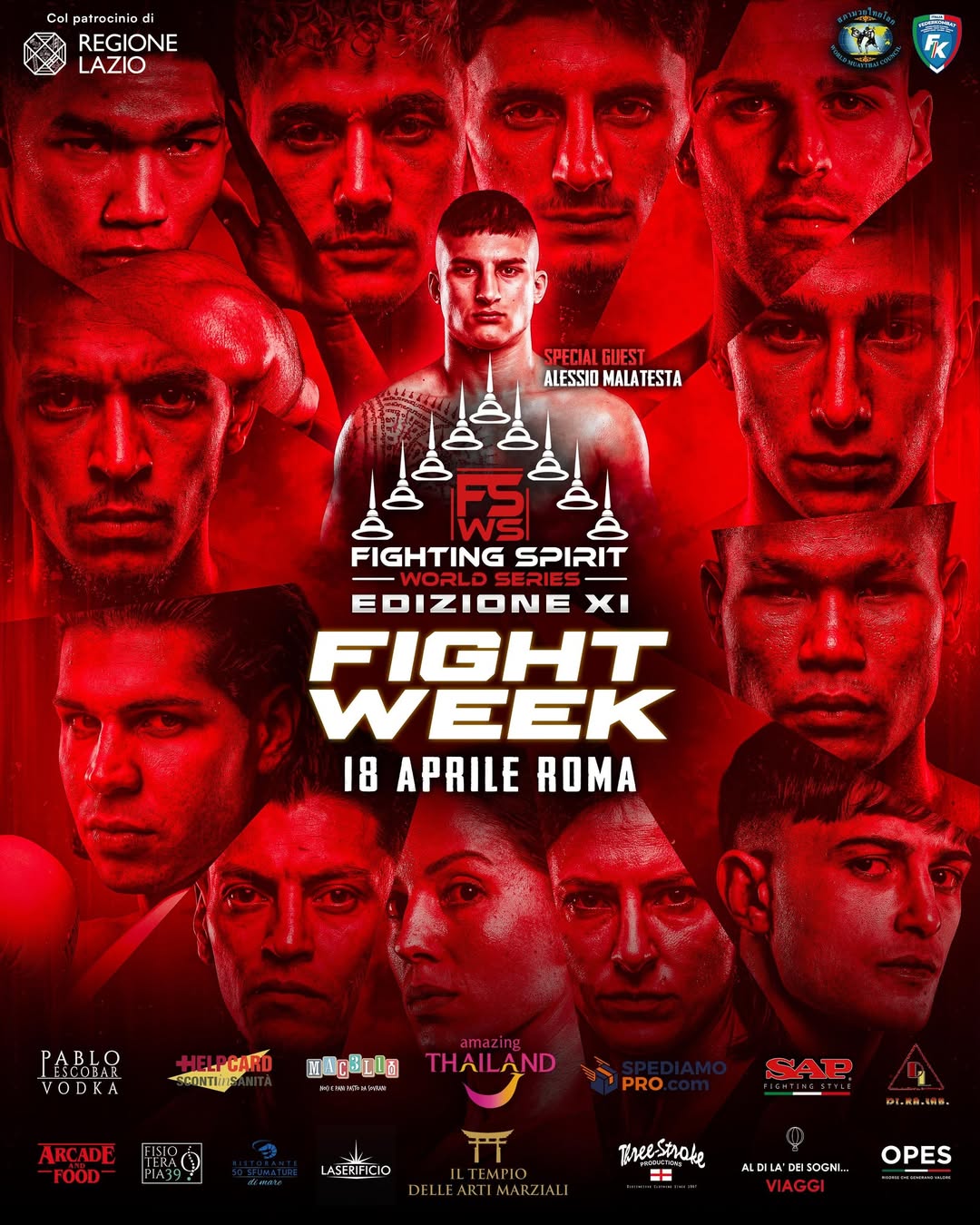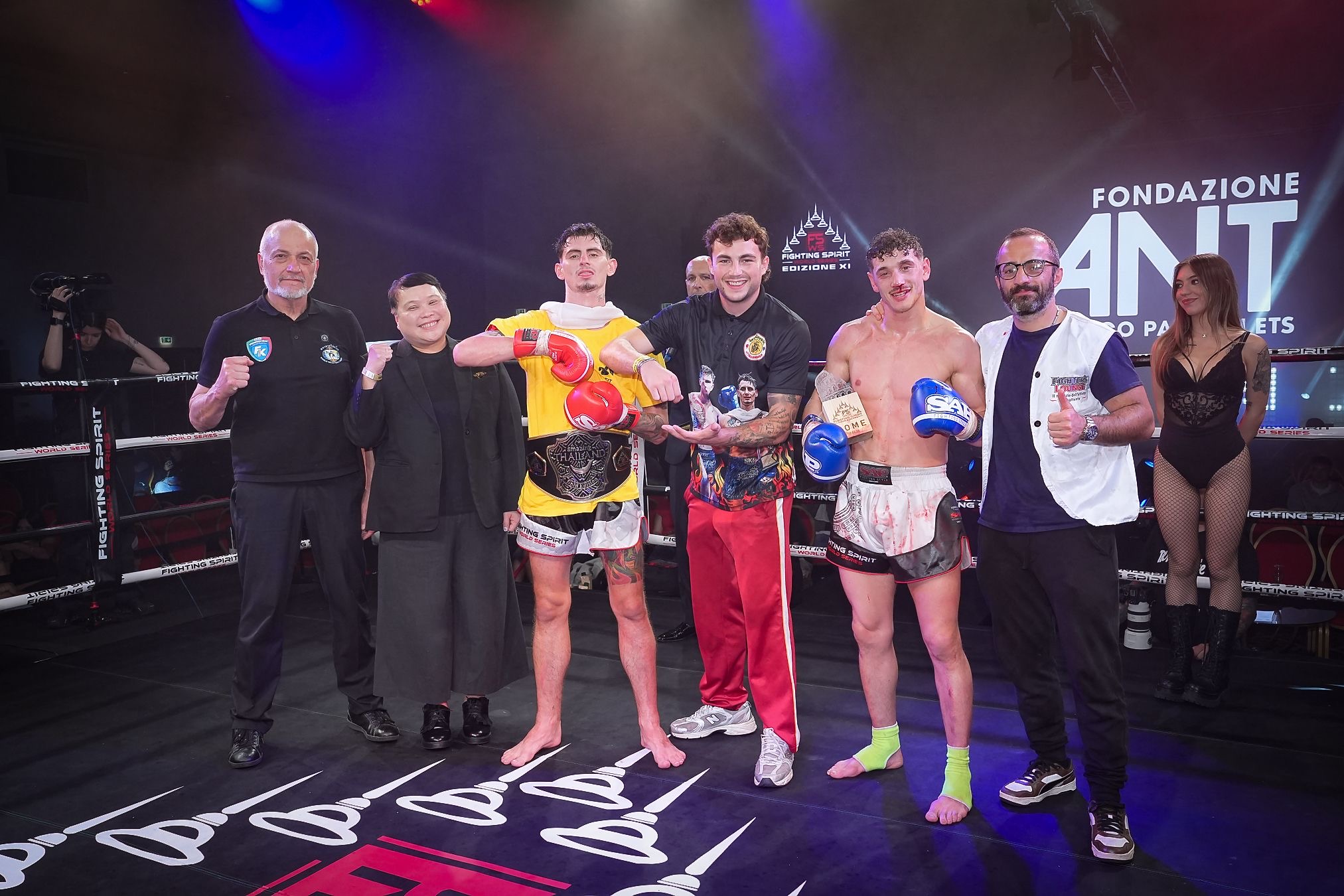 Si è svolta, ieri sera, al Marriott Park Hotel di Roma la XI edizione di Fighting Spirit World Series, uno degli eventi (sotto l’egida di FederKombat) a firma del promoter romano Gianluca Colonnese (nella foto in primo piano al centro), che, ad anni alterni, organizza anche l’altra kermesse (denominata “Thai Fight“) dedicata, come questa, principalmente allo spettacolo della muay thai. La manifestazione in esame ha visto il patrocinio/collaborazione di Regione Lazio, OPES e Amazing Thailand.