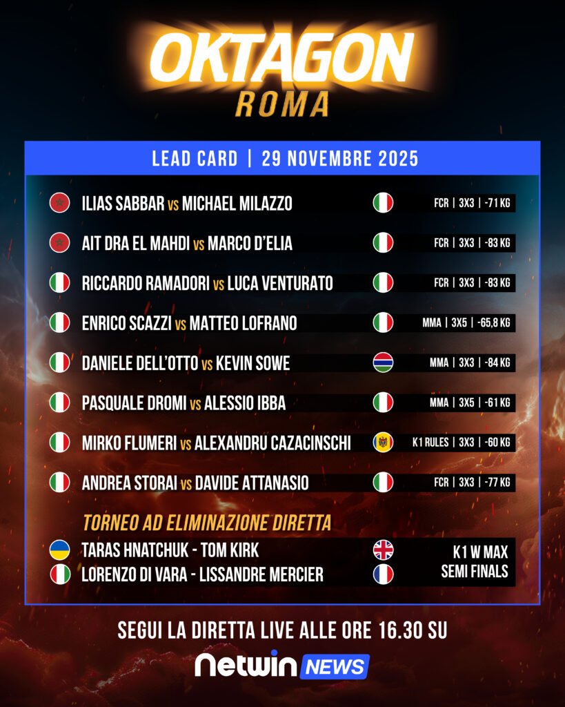Sabato 29 novembre 2025 si svolgerà, al Pala Pellicone di Ostia, la 29ima edizione di Oktagon, il galà italiano per eccellenza nel settore degli sport da combattimento (ideato nel 1996 dal promoter milanese Carlo Di Blasi). Tre discipline previste (kickboxing, muay thai e MMA), due format speciali (la qualificazione europea, ad eliminazione diretta, per il …